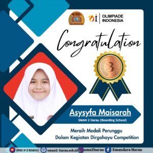 Asysyfa Maisarah, siswa kelas XII IPS meraih medali perunggu dalam kegiatan Olimpiade Nasional, Dirgahayu Competition (Bidang Bahasa Indonesia). Kegiatan ini dilaksanakan secara online pada tanggal 14 Agustus 2023. Semoga prestasi untuk berikutnya dapat ditingkatkan lagi.